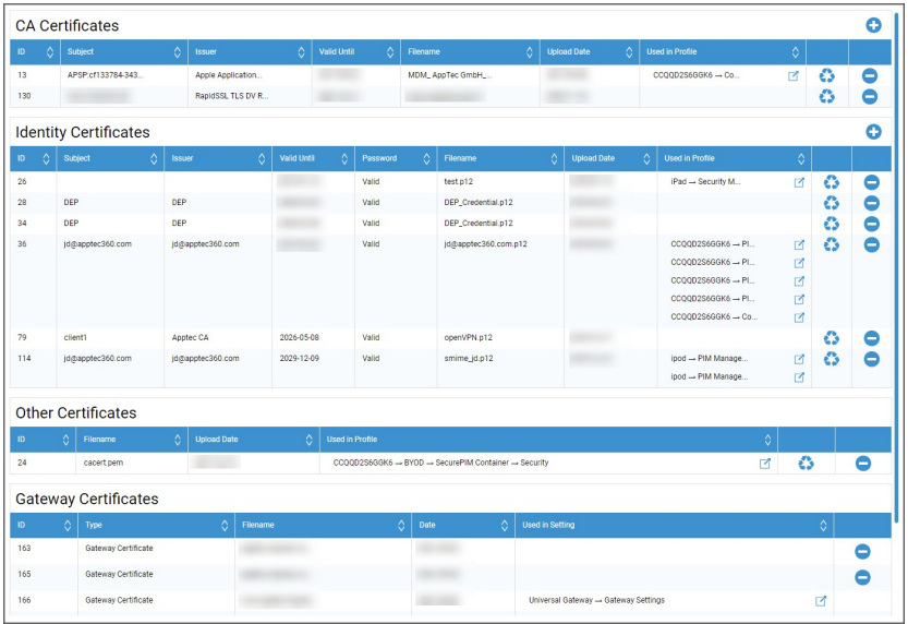 Hier erhalten Sie einen Überblick über alle hochgeladenen und in der Konsole verwendeten Zertifikate. Dies ist nur ein Überblick. Die eigentliche Konfiguration für z.B. Wi-Fi-Zertifikate erfolgt weiterhin im Profil an der entsprechenden Stelle.