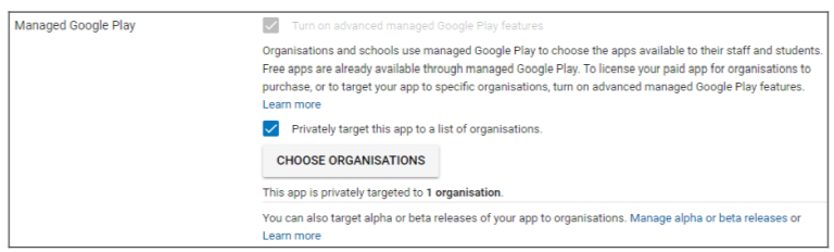 Hinweis: Vergewissern Sie sich, dass Sie die beiden Kontrollkästchen bei „Managed Google Play“ unter „Preisgestaltung & Vertrieb“ aktiviert haben. Andernfalls ist die App öffentlich und kann von jedem eingesehen werden. Achten Sie auch darauf, das Land für die Verteilung zu wählen.