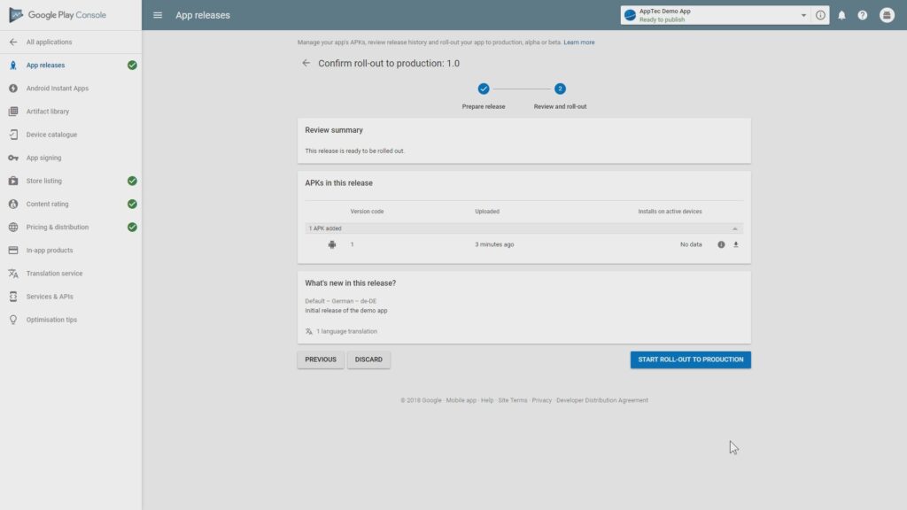 Nachdem Sie alle Schritte abgeschlossen haben, können Sie zu „App-Veröffentlichungen“ gehen. Klicken Sie auf „Review“ und „Start Roll-Out to Production“, um Ihren Entwurf fertig zu stellen und die App zu veröffentlichen.