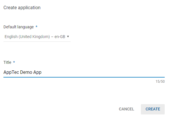 Klicken Sie auf „Anwendung erstellen“. Wählen Sie Ihre Standardsprache und den Titel der App.