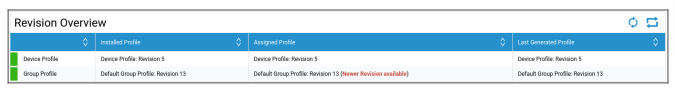 „Neuere Revision verfügbar“ bedeutet, dass das Gruppenprofil geändert und gespeichert, aber nicht zugewiesen wurde. Das Gruppenprofil muss mit „Jetzt zuweisen“ auf Gruppenebene zugewiesen werden, um die Änderungen auf die Geräte anzuwenden.