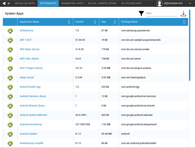 Unter „System-Apps“ werden alle vorinstallierten Systeme mit ihrem Paketnamen und ihrer Version aufgelistet.