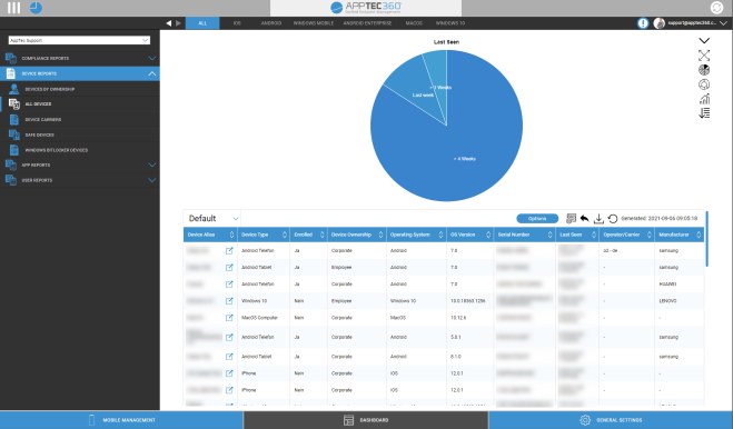 Bitte beachten Sie, dass Sie nur manuell ändern können, welche Daten angezeigt werden. Die gewählte Berichtskategorie definiert die Daten, auf denen dies basiert. So können Sie z.B. niemals Android-Geräte im iOS-Bericht in Geräteberichte Alle Geräte iOS sehen.