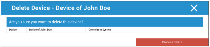 Hier kann ein Löschbefehl ausgeführt werden. Sie können noch einmal entscheiden, ob das Gerät nur aus AppTec360 entfernt werden soll („Aus dem System löschen“) oder ob das Gerät aus AppTec360 entfernt und zusätzlich auf die Werkseinstellungen zurückgesetzt werden soll („Wipe & Delete“).