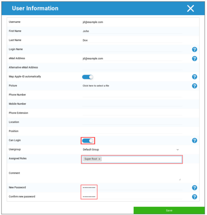 Aktivieren Sie den Schalter für „Kann sich anmelden“, weisen Sie dem Benutzer die Rolle „Super-Root“ zu und legen Sie ein Passwort fest.