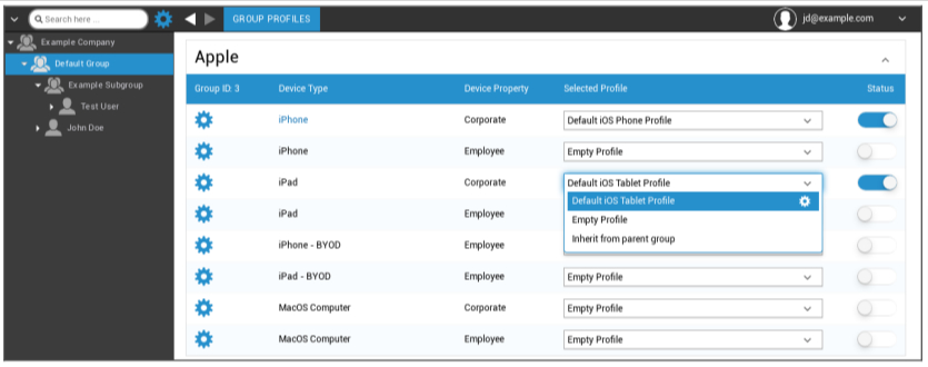 Nachdem Sie auf eine Gruppe geklickt haben, erhalten Sie eine Übersicht über alle zu konfigurierenden Geräteplattformen und die jeweils zugeordneten Profile.