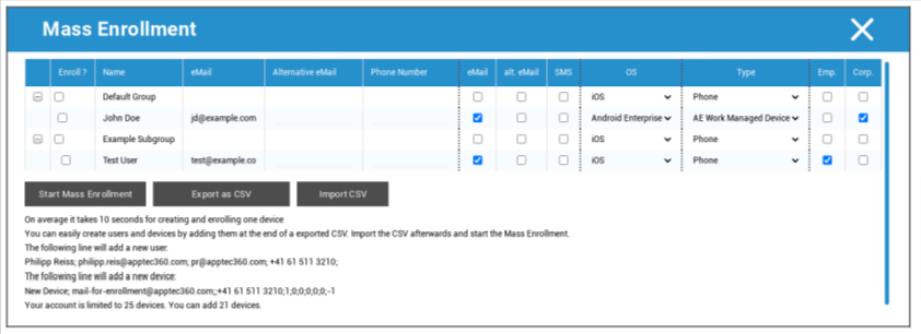 Mit der „Massenregistrierung“ können Sie mehrere Geräte und Benutzer registrieren.