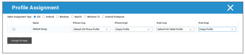 Unter Massenzuweisung können Sie allen Gruppen ein Profil zuweisen, dies ist unterteilt in iOS – Android – Windows – MacOS – Windows 10 – Android Enterprise