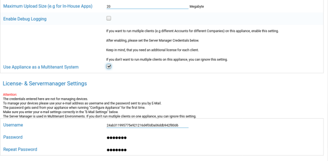 Legen Sie in dem neuen Menü einen Benutzernamen und ein Passwort für den Servermanager fest. Speichern Sie die Einstellungen und führen Sie „Appliance konfigurieren“ in „Schritt Fünf – Lizenzvereinbarung“ aus, um die Einstellung zu übernehmen.
