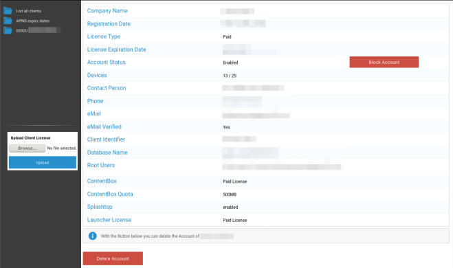 Auf der linken Seite sehen Sie alle Mieter (in diesem Fall nur einen mit der ID 920) und auf der rechten Seite die Informationen zu diesem Kunden. Sie haben auch die Möglichkeit, den Zugriff auf das Konto zu sperren und den Client zu löschen (ACHTUNG: Dadurch werden alle Daten zu diesem Client gelöscht).